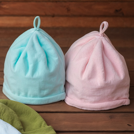 やさしいカラーが魅力のサウナハット。大きめサイズで髪をまとめてもスッキリ入る。深めの設計でしっかりしっかり熱対策してくれます。