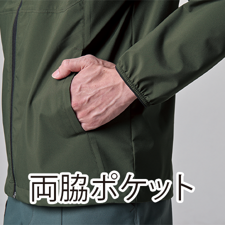 落ち着いた印象のマットな素材は、心地良いなめらかな肌触り。伸長率15%のストレッチ性のおかげで、腕の上げ下げはもちろん、大きく動いても体にフィットする快適な着心地です。幅広いアクティビティーに対応する万能なウインドブレーカージャケットです。撥水加工で急な雨でも安心。袖口はカフスゴム仕様で冷気が入るのを防ぎます。