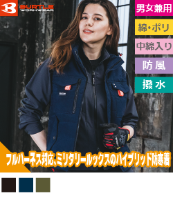 防風性・撥水性・耐久性を兼ね備えた肌触りの良いヌバック素材を使用した防寒べスト。耐久性にも優れているので、屋外での現場作業に最適です。フルハーネスの装着に対応する本格的なミリタリールックスのハイブリッド防寒着です。