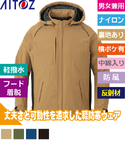 耐久性に優れたナイロン素材と、遠くからも目立つ反射材でハードな現場に対応!ヘルメット対応フード、雨風の侵入を防ぐ二重袖口など必要な機能を完備しながらかっこよさを両立した本格防水防寒です。生地の縫い目から水の侵入を防ぐシームテープ付き。サーモトロンラジポカによる優れた保温性も魅力。